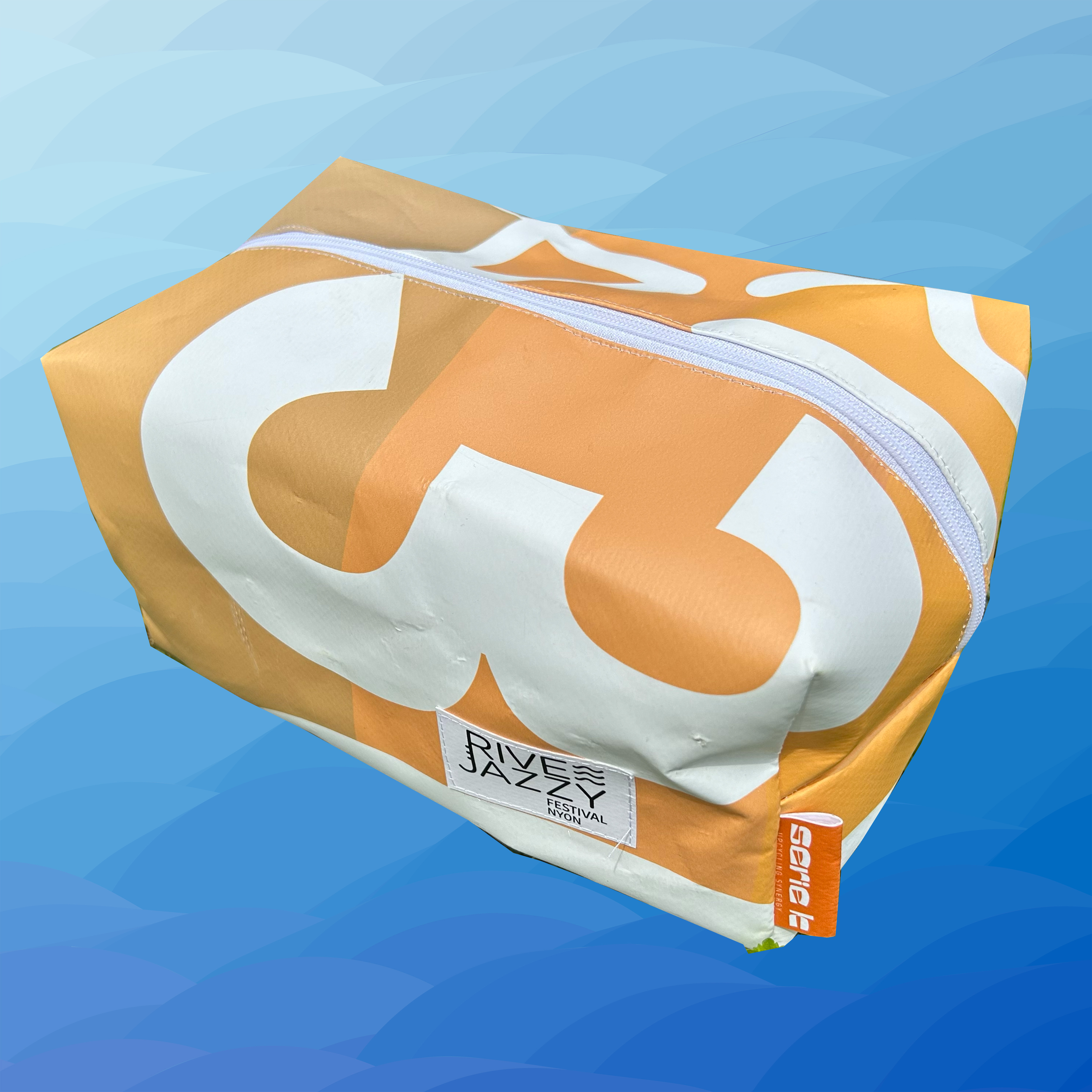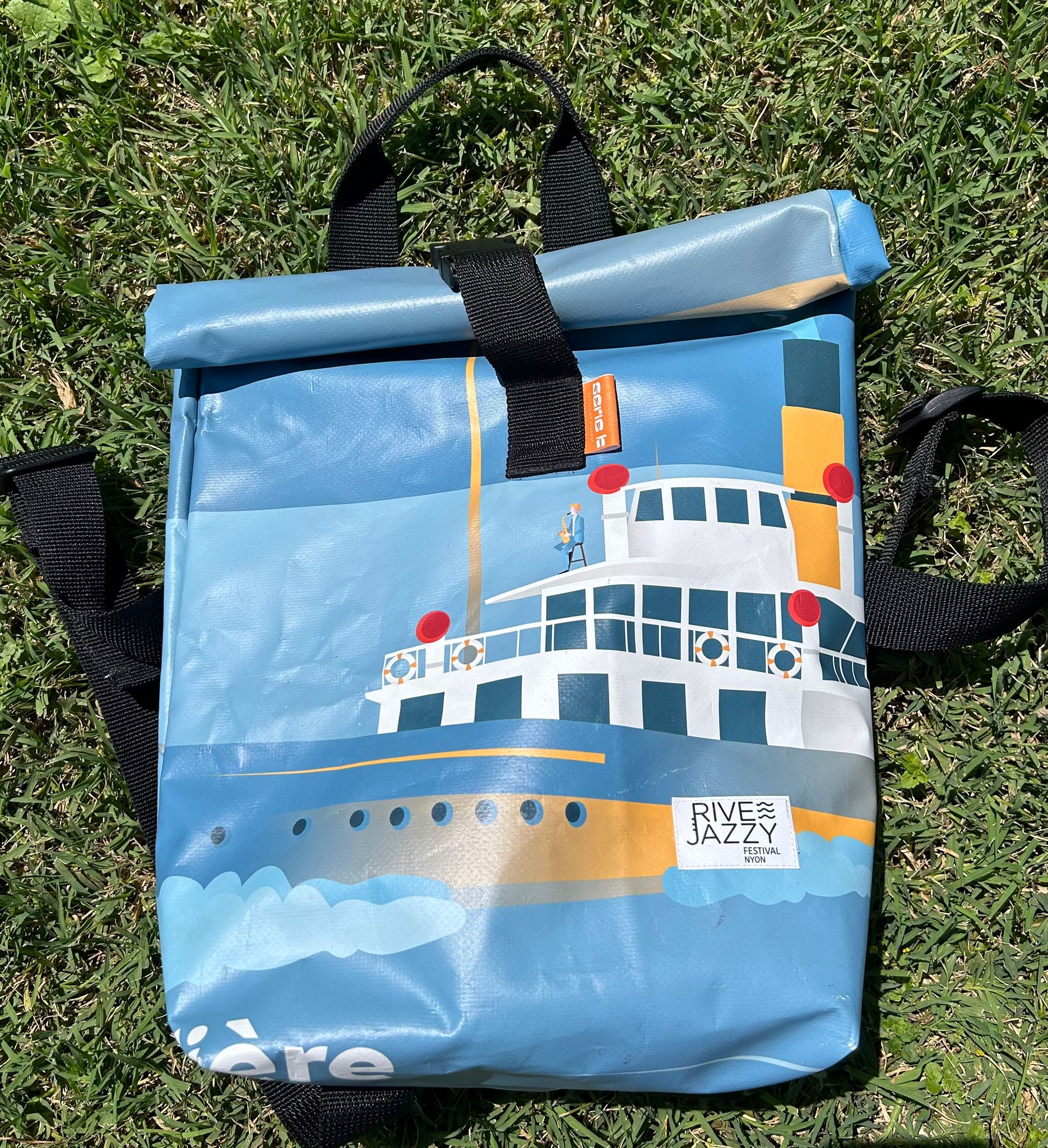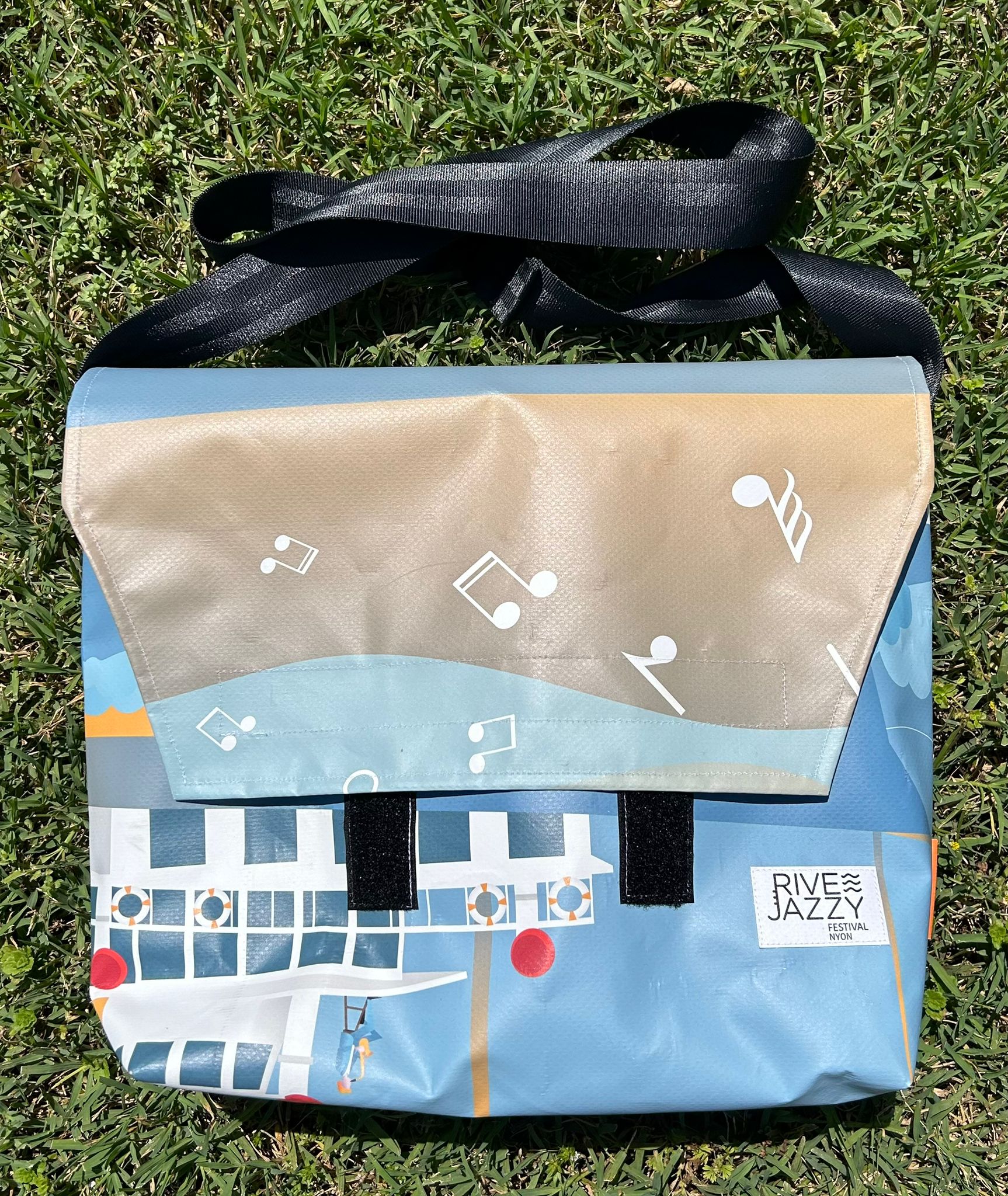 Dans une démarche durable, nous transformons les anciennes bâches du festival en pièces uniques. Découvrez ces créations artisanales ci-dessous :